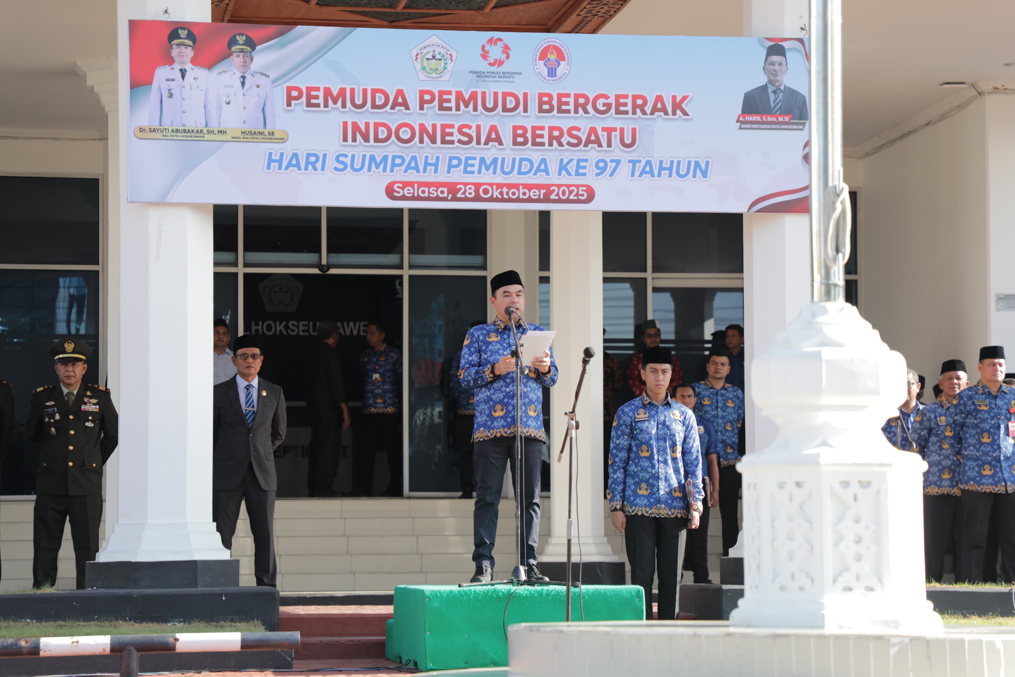 Wali Kota Lhokseumawe, Dr. Sayuti Abubakar, SH., MH, memimpin langsung upacara peringatan Hari Sumpah Pemuda ke-97 Tahun 2025 yang berlangsung khidmat di Halaman Kantor Wali Kota Lhokseumawe, Selasa (28/10/2025).…