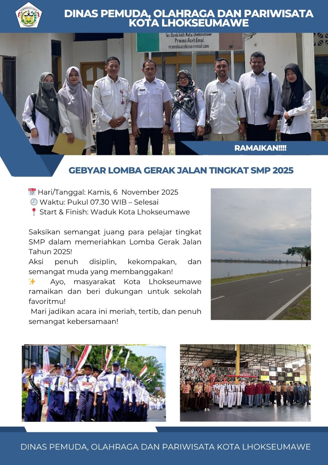 Gebyar Lomba Gerak Jalan Tingkat SMP 2025Wujud Semangat, Disiplin, dan Kebersamaan Pelajar Lhokseumawe Dinas Pemuda, Olahraga dan Pariwisata (Disporapar) Kota Lhokseumawe mengajak seluruh masyarakat untuk…